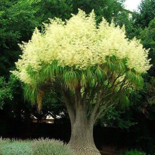 Las flores se encuentran en especímenes más viejos, ya que solo aquellos con características arbóreas pueden producir flores. Estas hermosas flores nacen de inflorescencias largas y erguidas con muchas flores pequeñas y blancas.