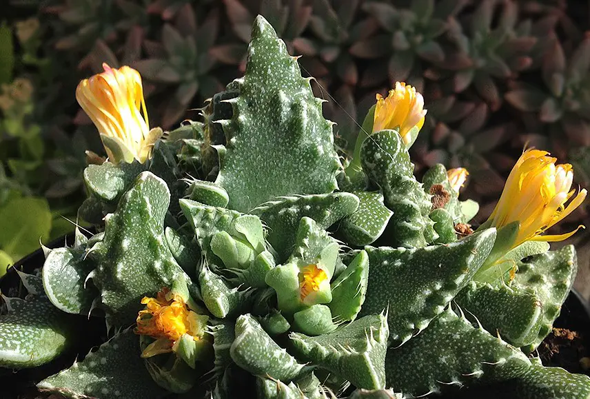 Originaria de Sudáfrica, esta es una pequeña suculenta resistente y muy decorativa. Su nombre científico es “Faucaria Tigrina” y se la conoce popularmente como Boca-de-tigre porque tiene “dientes” blancos y suaves a lo largo de sus hojas que se asemejan a la boca de un animal.