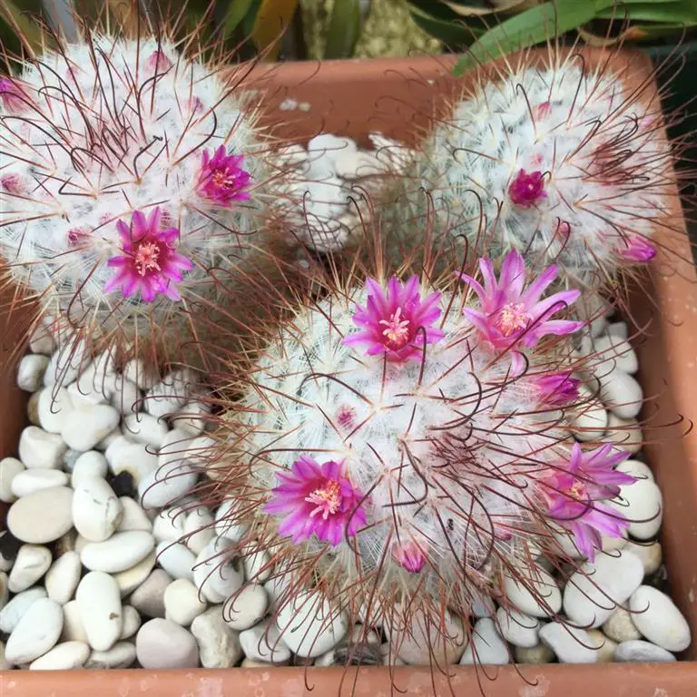 Después de la polinización, se forman frutos parecidos a bayas de color rosa verdoso. Las formas y texturas de cactus y suculentas son siempre muy encantadoras, y mammillaria bombycina no podría ser diferente.