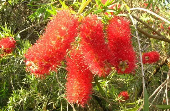 Las inflorescencias son el mayor encanto de este árbol, tienen forma cilíndrica, con numerosos estambres rojos, que, según la variedad, pueden ser rosados ​​o amarillentos, recordando a los cepillos de botella.