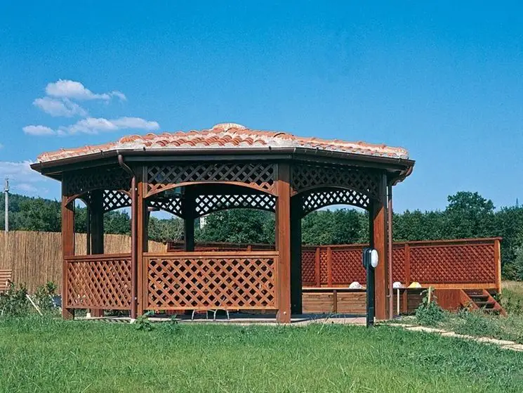 Un cenador de madera de planta cuadrada será bastante fácil de hacer. Después de esperar a que se seque el concreto, los postes de soporte se pueden quitar de los postes. Para que la estructura sea más estable, puede proporcionar vigas que unan los postes de apoyo en los extremos más altos, pero también a nivel del suelo, excepto en la entrada. Para asegurarlos, use pernos de cabeza redonda. Para las paredes, puede usar rejillas de madera ya hechas o hacer los paneles usted mismo. También se puede cubrir con vigas macizas hasta cierta altura, sin exagerar, y continuar con las rejas más arriba. Para la marquesina, deberá hacer una estructura de carga de madera muy estable, que se cubrirá con paneles de policarbonato.