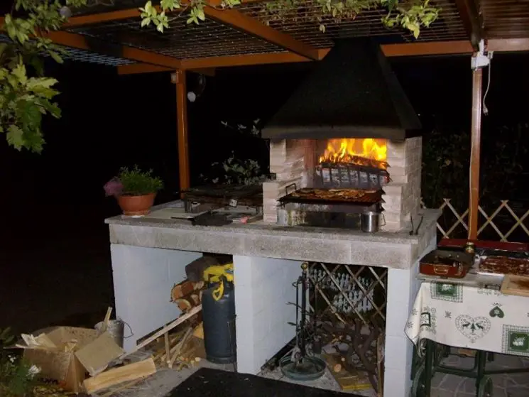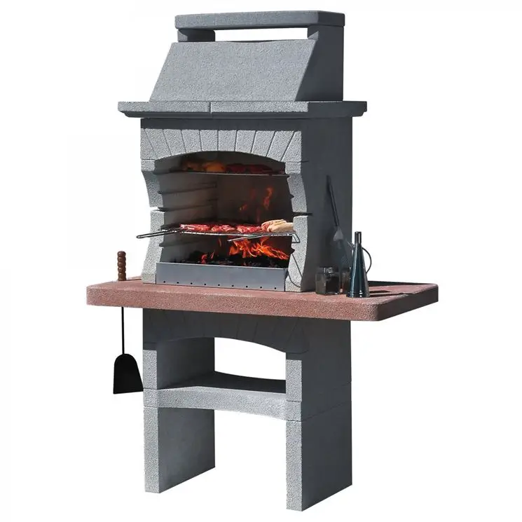 Existen varios modelos de chimeneas de jardín de mampostería fabricadas con ladrillos refractarios, resistentes a cambios térmicos severos y altas temperaturas (hasta 1.300 grados centígrados). Estas chimeneas consisten en una campana de ladrillo o mampostería y están equipadas con una parrilla, para una cocción óptima de los alimentos y un cenicero. Los modelos más recientes también están equipados con un hogar de acero, cerrado por una puerta ignífuga en vidrio templado. Otras variantes de chimeneas de exterior funcionan con GLP: estos modelos no necesitan salida de humos y están equipados con un compartimento para alojar el cilindro. Otras versiones prevén una fuente de alimentación de bioetanol o una instalación en la pared (en este caso la chimenea tiene una forma curva y sinuosa particular). Finalmente,