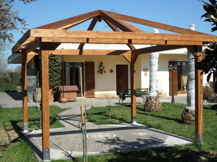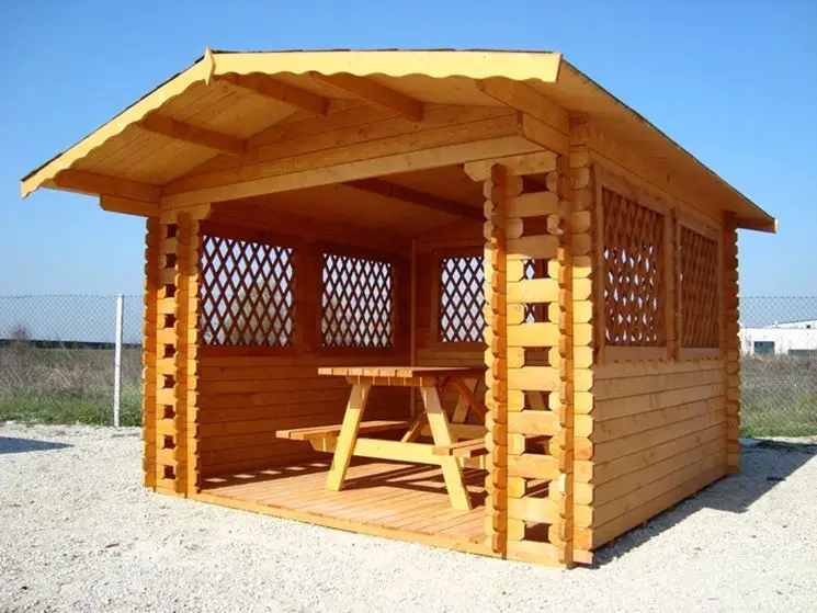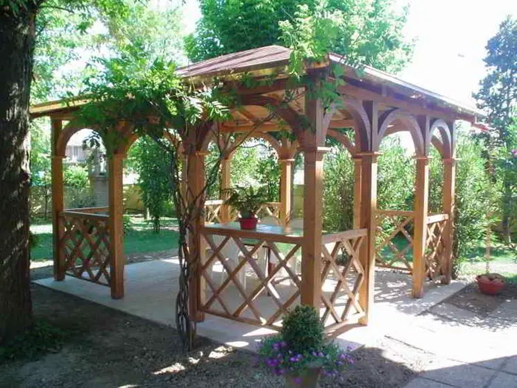 Los siguientes pasos, de cómo construir una glorietaen madera, prever el montaje de las vigas de soporte. Se colocarán perpendiculares a los postes de soporte y al menos dos a cada lado. Para ello necesitaremos la ayuda de dos o tres personas. La unión de las vigas se realizará mediante grandes tornillos o pernos insertados en el centro de cada viga y unidos al poste de apoyo. Antes de proceder a la inserción de los tornillos, será recomendable perforar con un taladro agujeros en el punto donde se alojarán los tornillos. Esta operación facilitará nuestro trabajo. Al menos una persona tendrá que soportar la viga de soporte, mientras que la otra fijará los tornillos. Si se han dispuesto aberturas de ventana en los lados de la glorieta, estas medidas deben calcularse para la posterior inserción de los marcos de las ventanas.
