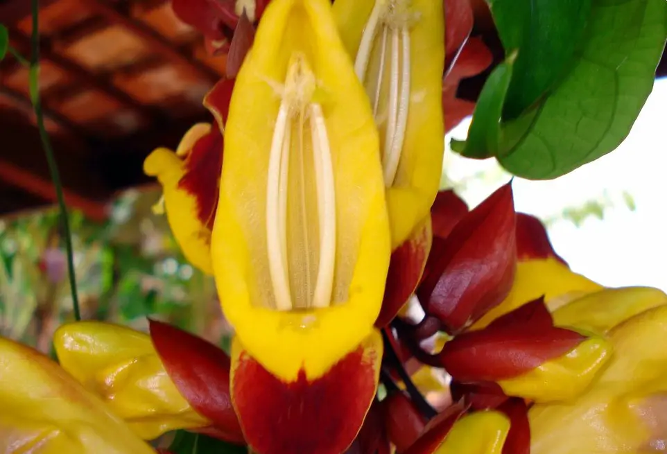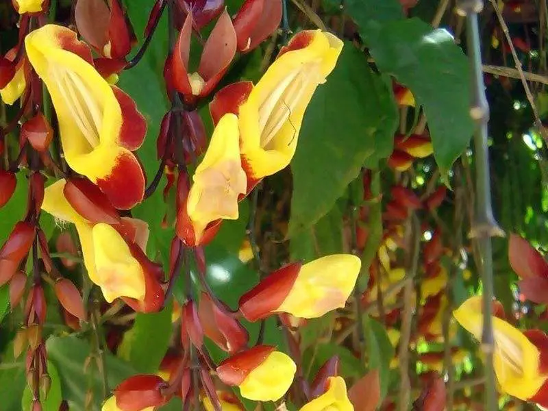 Perteneciente a la familia de las Acantaceae, la vid, popularmente llamada zapatilla de Judia, es una especie trepadora que puede llegar a medir hasta 6 my su principal característica son sus delicadas flores amarillas y cobrizas.
