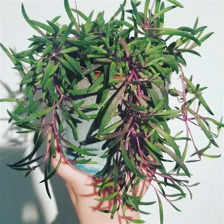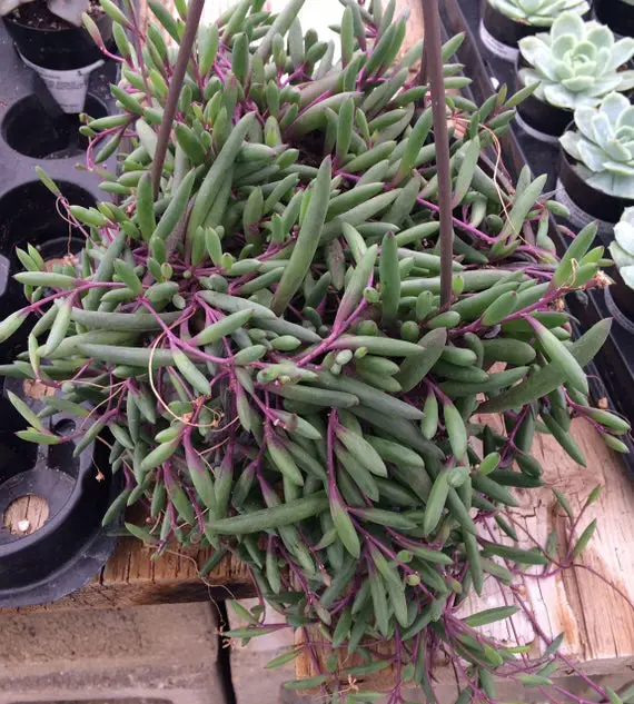 Cuando está bien cultivado y desarrollado, el suculento collar de rubí adquiere una apariencia ornamental de planta colgante. Sus hojas verdes, a lo largo de los tallos rojizos, se asemejan a pequeños pepinos.