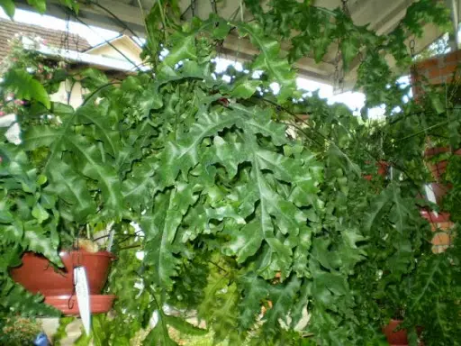 Una de las principales diferencias de esta especie, frente a la más clásica, es la forma de las hojas, que son más grandes y tienen un menor espaciado entre ellas. Sus hojas arqueadas y colgantes pueden alcanzar hasta 1 m de longitud, dependiendo de los cuidados.