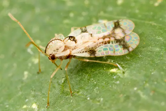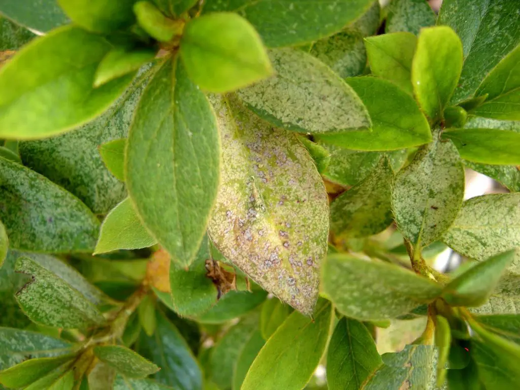(Stephanitis pyrioides): estos insectos perforan con un estilete y eliminan el contenido celular de los tejidos de las hojas y eliminan casi toda la clorofila ubicada cerca de la epidermis superior, lo que hace que la superficie de la hoja se vuelva blanquecina o plateada. Esto daña la hoja sobre la que se seca y cae.