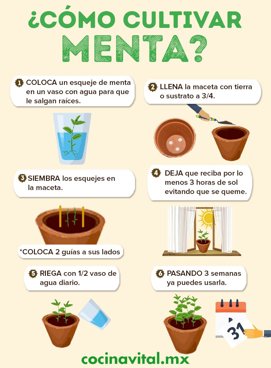 La menta es una planta muy longeva. La siembra debe hacerse con la llegada de la primavera, aunque por comodidad es mejor comprar las plántulas para transplantarlas directamente en macetas o en el jardín. La menta también tiende a reproducirse de manera más sencilla mediante el corte a partir de los picos vegetativos de por lo menos 20 y el corte de la planta a partir de marzo-abril o principios de otoño, procediendo con una tijera afilada y bien lavada para no infectar los tejidos de la planta.