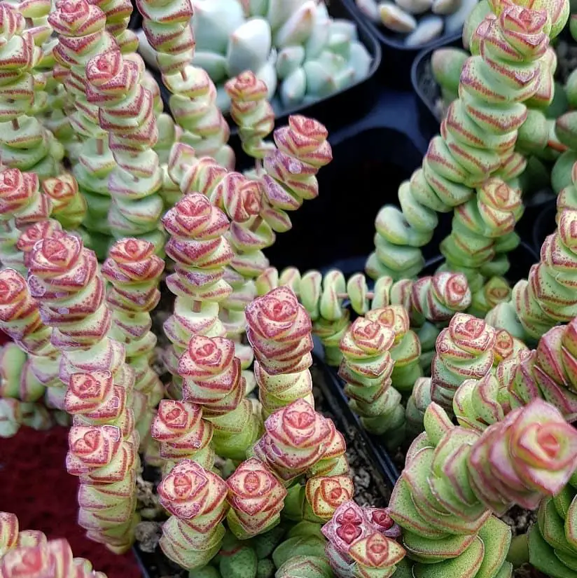 El género Crassula puede superar las 200 especies. Crassula marnieriana es una de las únicas, con hojas gruesas apiladas verticalmente, bordeadas de rosa rosa.