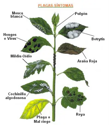 Otras pruebas de plagas y enfermedades de las plantas pueden ser la amarillez de las hojas o la aparición de manchas más o menos grandes i, que cambian de forma y color, según el agente infeccioso responsable.