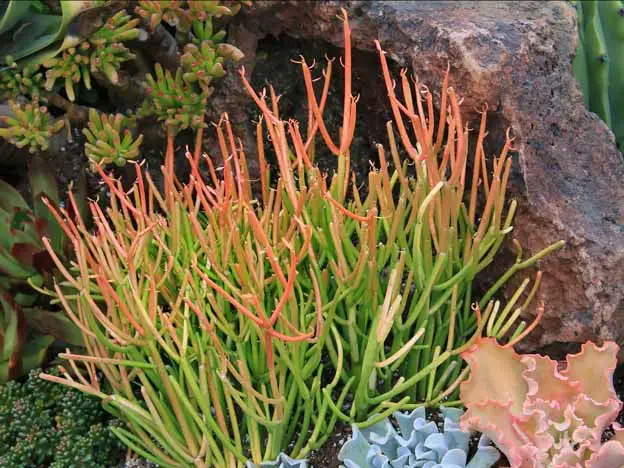 Una hermosa suculenta a pleno sol, que no sufre estos problemas de quemaduras de hojas, aunque tenga muy pocas, es la popular aveloz, Euphorbia tirucalli.