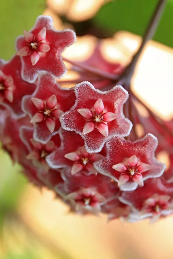 Hoya carnosa es una suculenta planta trepadora que tiene un ramo de flores en forma de estrella que generalmente se abren en primavera o verano. Es una especie de media sombra, lo que significa que le gusta la luz difusa.