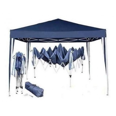 • Datos técnicos: Altura: 250cm - Superficie construida: 3x3m - Superficie de techo construida: 2,6x2,6 m - Color: azul - Material tejido: 100% Poliéster - Material de la estructura: Acero - Incluye: 1x Pabellón; 4x paredes laterales en azul; 8x estacas; Cuerdas de tensión; Material de montaje