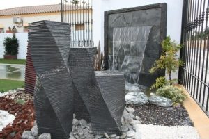 Las fuentes muy ornamentales «»esculturas»» de acero inoxidable o metal, con formas geométricas son verdaderos elementos decorativos. Se adaptan perfectamente a los jardines contemporáneos u orientales, a los que añaden una nota muy «»trendy»».