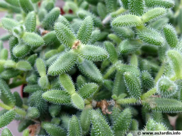 Delosperma echinatum , la delosperma peluda, es una planta suculenta muy bella que pertenece a la familia Mesembryanthemaceae o Aizoaceae, está emparentada con las plantas comúnmente llamadas ficoïds. Delosperma echinatum es nativa de Sudáfrica, es un subarbusto que crece en el borde de los arroyos o en el borde de los arbustos en la región del Cabo de Sudáfrica. La planta gorda es completamente peluda a la manera de la hermosa Sedum hintonii , Delosperma echinatum es tanto original como fascinante, pero fácil de cultivar.