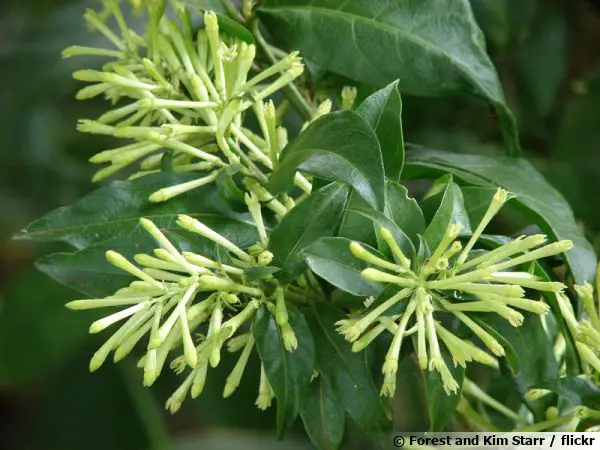 Sus flores se desarrollan en las axilas de las hojas en la parte superior de las ramas, en múltiples racimos. Alargadas y poco abiertas, estas flores atraen por su fragancia a sus polinizadores nocturnos. Aunque numerosas, no son espectaculares: son pequeñas trompetas blanco-amarillentas. Pero la planta se cultiva muy comúnmente por su excepcional fragancia que da todo su poder cuando cae la noche. Este aroma intermedio entre el jazmín y el tilo se extiende hasta 100 metros de distancia cuando hace calor.