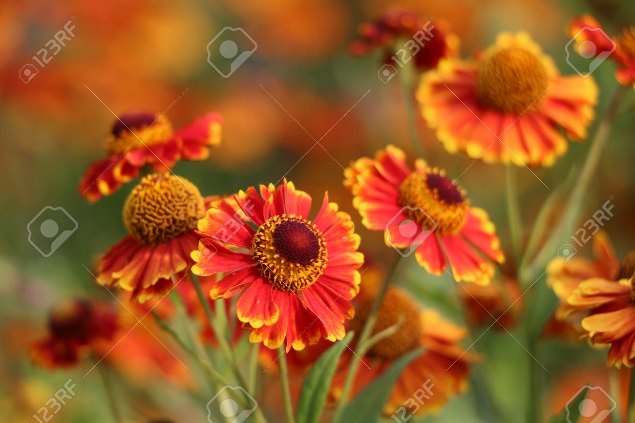 - Helenium autumnale Redgold o Helenium autumnale Red and Gold, con lígulas amarillas lavadas con rojo, de aproximadamente 1m de altura.