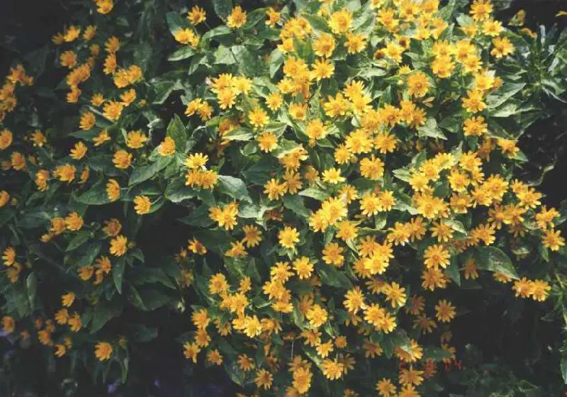 Su follaje es exuberante. Compuesta por hojas caducas de color verde claro de forma ovalada y romboidal (con hojas jóvenes casi lanceoladas), forma un amplio cojín vegetal de unos 50 cm de altura. De junio a octubre, está cubierto de pequeñas flores amarillas en forma de margaritas con corazones de color naranja, posadas en largos tallos.