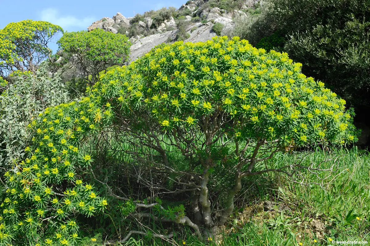 Euphorbia dendroides , la espuela arbustiva, es una especie autóctona de gran belleza distribuida por todo el Mediterráneo. Euphorbia dendroïdes forma parte de la gran familia de las Euphorbiaceae, por lo tanto heteróclita: es una espiga arbustiva que se especializa en ambientes muy calientes y muy secos: una planta xerófila que se puede describir como semisuculenta.