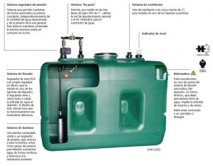 - Longitud 289 cm, Ancho 230 cm, Alto 132 cm, Peso 250 Kg. Diseñado específicamente para la recuperación de agua de lluvia.