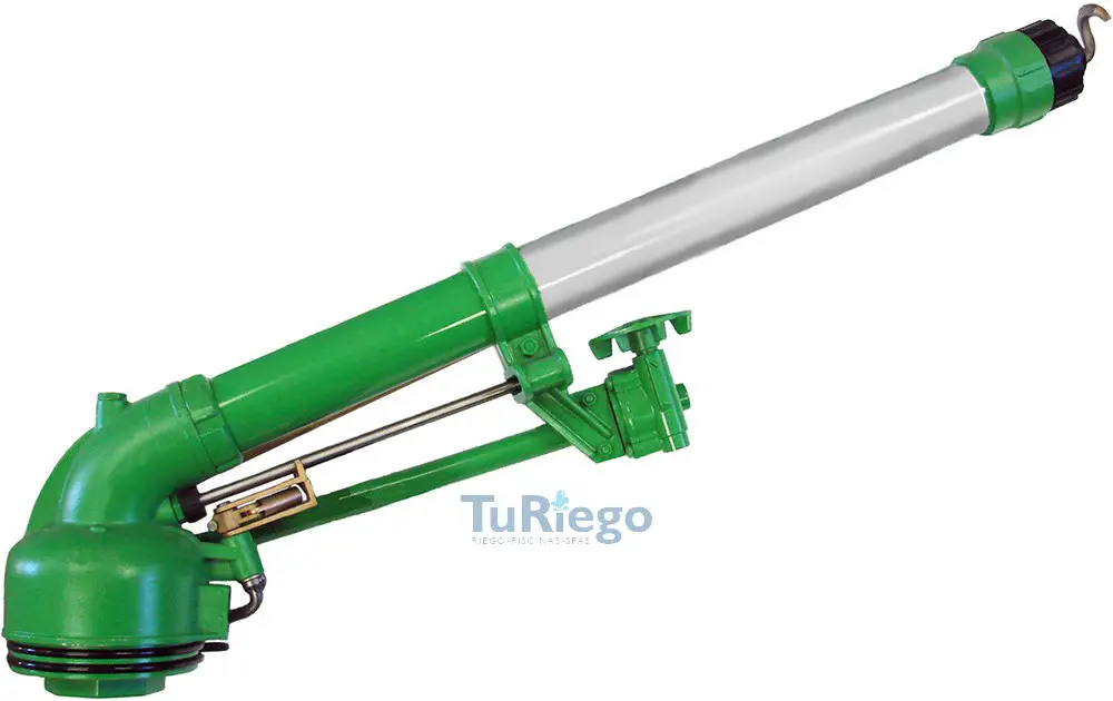 - Cañón de riego de alto rendimiento con capacidad de rotación de giro completo o en el rango de ajustes de ángulo deseado, de tipo impacto y de presión media (2,0 - 4 atm).