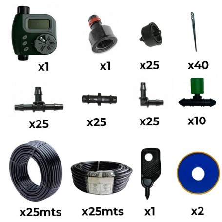 - Microtubo de 4 mm de diámetro y 25 m de longitud, con reductor de presión a 1 bar y adaptador de grifo 3/4". Con programador de riego que incluye dos diales para fijar intervalo y duración de riego