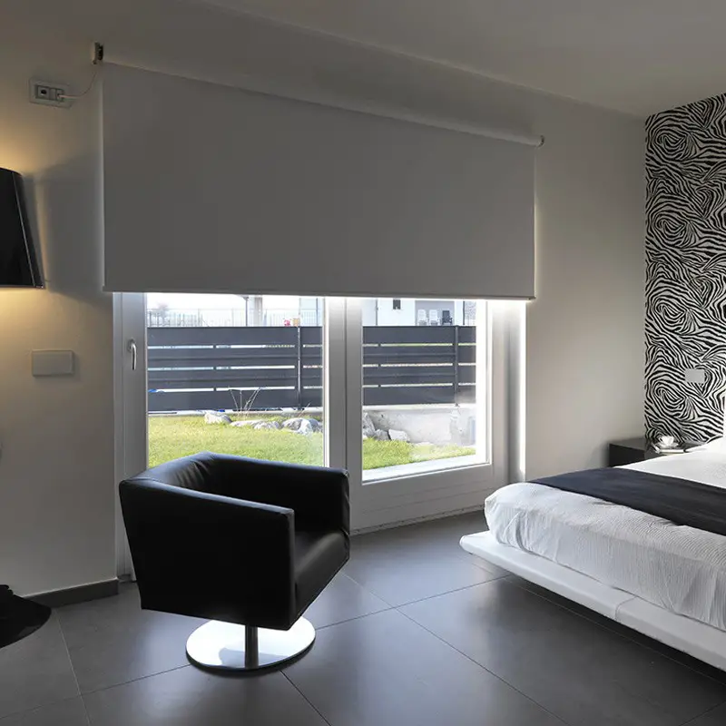 - Cortina enrollable con efecto noche y efecto día. Con doble tejido que gradúa la entrada de luz.