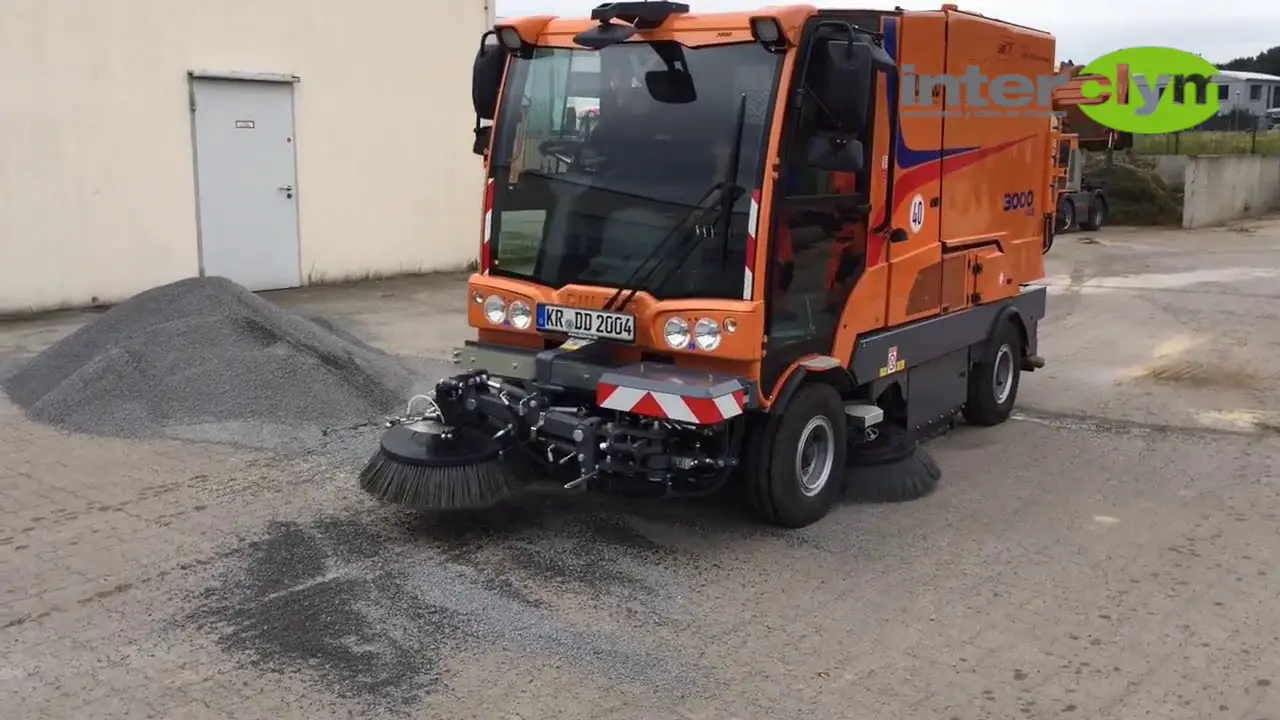 - La barredora incluye cepillos en las ruedas delanteras y un cubo de basura que se transporta en la parte trasera del vehículo; está formada por dos partes articuladas que giran hacia ambos lados