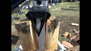 - El bloque de madera se sujeta bajo el filo de hacha, se eleva el peso de caída y luego se deja caer. Esto hace que la hoja separe el bloque de madera. El peso de caída también se puede lanzar hacia abajo, lo que aumenta considerablemente la fuerza de corte.