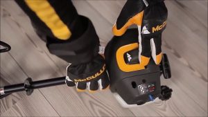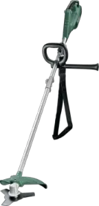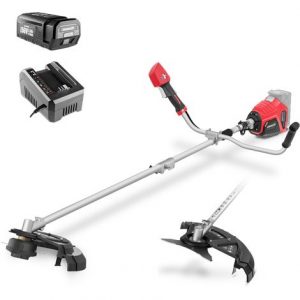 - La desbrozadora con batería de fácil uso se hace funcionar con un motor frontal, que garantiza una transmisión de fuerza y distribución de peso óptimas. La empuñadura a dos manos se puede utilizar de forma universal en la versión de manilla de bicicleta.