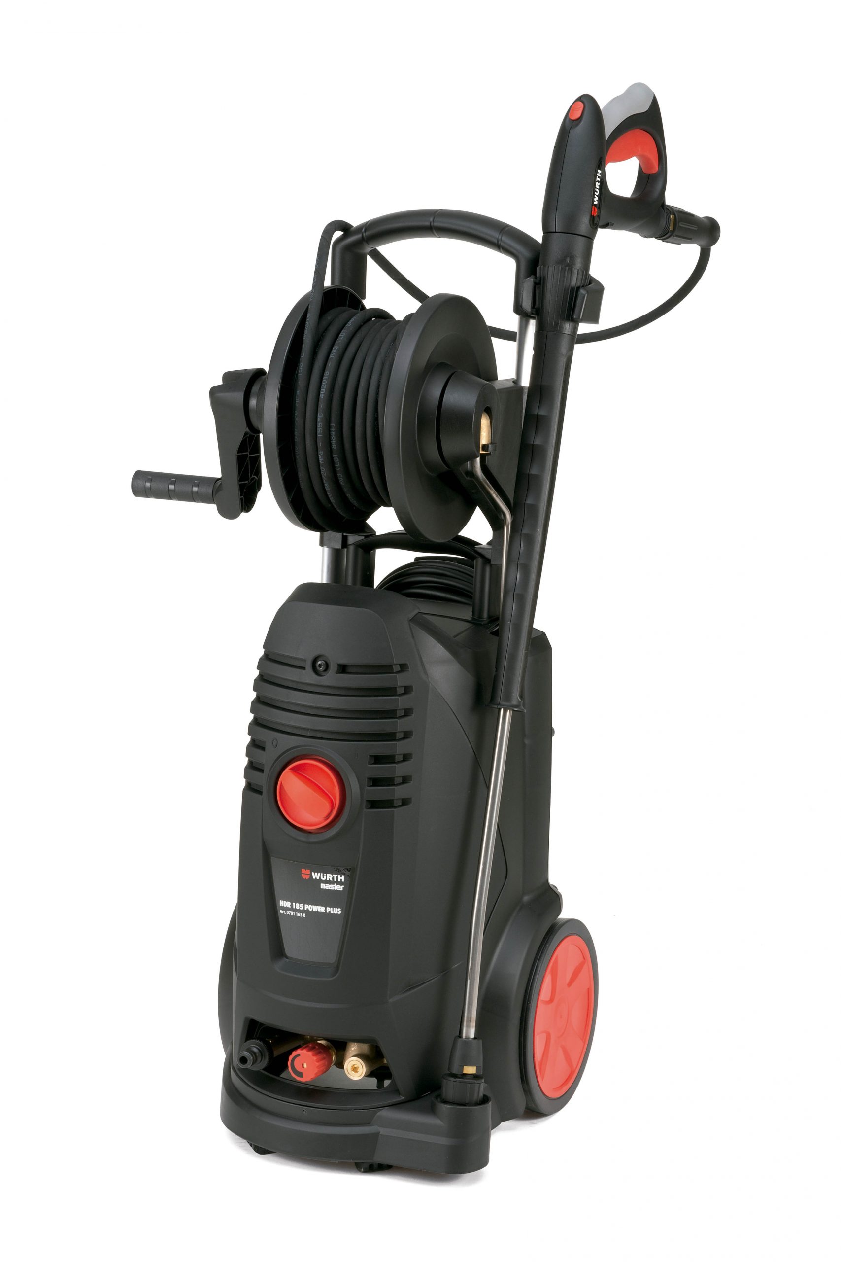 - Amplio enrollacables lateral para recoger el cable de manera ordenada. Permite colocar y sujetar la pistola verticalmente y sin esfuerzos junto al cuerpo. Manguera de alta presión de 3 metros de longitud para ofrecer amplia libertad de movimiento.