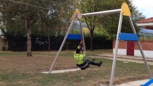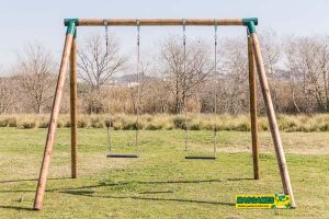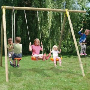 - También hay un tercer asiento en el centro, con forma de balón de fútbol. Gracias a las 2 asas de agarre, los niños se sientan con seguridad y pueden agarrarse bien mientras se balancean