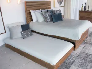 - Dispone de ruedas en la parte inferior de la cama extraíble y de los cajones para poder desplazar sin complicaciones. No incluye colchones, ropa de cama, almohadas ni ningún accesorio decorativo presente en la imagen.