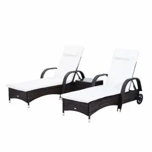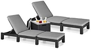 - Las tumbonas tienen dos reposacabezas extraíbles, dos sujetavasos (1 por cada silla) y dos sujetavasos (integrados en la mesita auxiliar).).