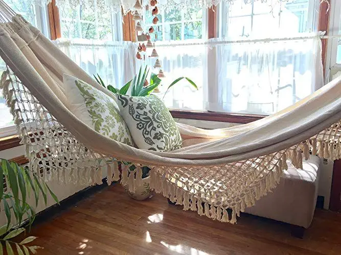 - Facilidad de cuidado: tela de lona de algodón lavable a máquina, fácil de cuidar y limpiar. Hamaca de lujo hecha a mano con flecos para 2 personas, un columpio para disfrutar de la naturaleza, ver una hermosa puesta de sol, colgar junto a la piscina o descansar en la terraza trasera - Acurrucarse en un nido acogedor mientras lee - Escuche los sonidos de la naturaleza a su alrededor