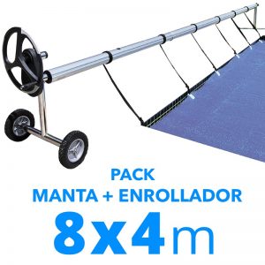 INTERNATIONAL COVER POOL Pack Cubierta Térmica 600 micras Eco para Piscina de 4 x 8 Metros con Refuerzo en los Anchos + Enrollador telescópico con Tubo de 80mm