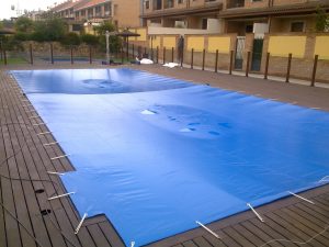 - Cubierta de PVC resistente y segura con alta tenacidad. Materiales de alta calidad. Esta cubierta de piscina es la más resistente del mercado. Sin dificultades de instalación, montajes seguros, anclajes con tornillos escamoteables de acero inoxidable (no molestan al andar) y gomas elásticas (tensores) resistentes. Todas las cubiertas son nuevas. Se fabrican una vez se ha hecho el pedido.