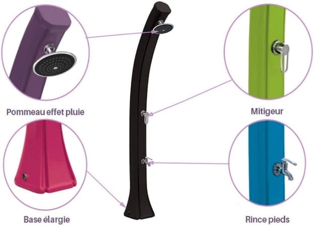 Además, ¡quién no caería bajo el hechizo de esta elegante ducha solar exterior, con un diseño moderno e inigualable! ¡Pero esas no son sus únicas ventajas! Porque bajo su aire de indiscutible robustez y elegancia, se esconde una ducha totalmente equipada, y realmente muy práctica. En effet, on retrouve également dessus un pommeau orientable, sur rotule, permettant de diriger le jet de douche plus ou moins vers soi, selon ses humeurs et ses envies, ainsi qu’un robinet en bas de colonne, pour laver ou simplement, rincer sus pies. ¡Y estas dos pequeñas cosas, que parecen nada, a menudo marcan la diferencia en términos de comodidad para el usuario! Entonces, ¿por qué prescindir de él, cuando está incluido en el precio?