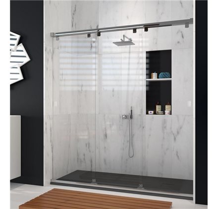 - Mampara de ducha frontal corredera fabricada con Cristal templado de seguridad de 6 mm. Con tratamiento antical INCLUIDO. Compuesta por 2 hojas fijas y 2 puertas correderas con apertura central. Tirador metálico cromado. Acabado disponible: Transparente.