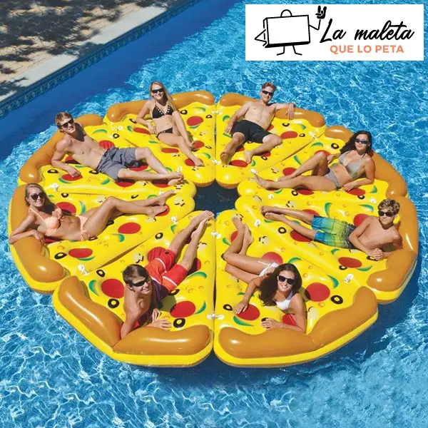 - Divertida colchoneta con diseño de porción de pizza deliciosa donde poder flotar cómodamente. Es el complemento que necesitas para tus fiestas en la piscina o en el mar