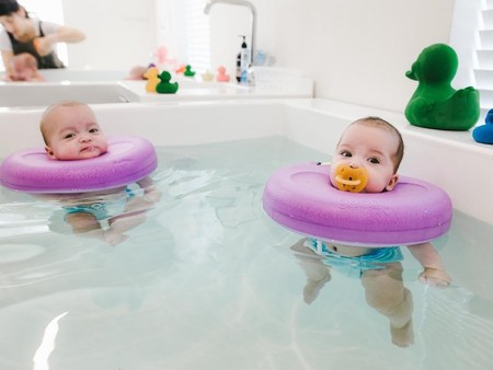 - Su bebé puede nadar completamente independientemente usando el anillo del baño de la nadada.