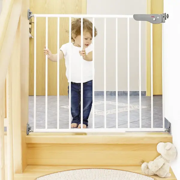 - FÁCIL DE USAR: esta barrera de seguridad se abre con una sola mano en ambas direcciones y está dotada de cierre automático, con una amplia anchura de paso para poder pasar junto a su hijo