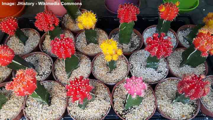 Estos colores brillantes de neón se desarrollan en plantas mutantes de Gymnocalycium mihanovichii que no producen clorofila, la sustancia que hace que las plantas se vuelvan verdes. Pero sin clorofila, los cactus, y todos los demás tipos de plantas, morirían. Entonces, para mantener vivo el cactus, el cactus redondo se injerta en un cactus regular.