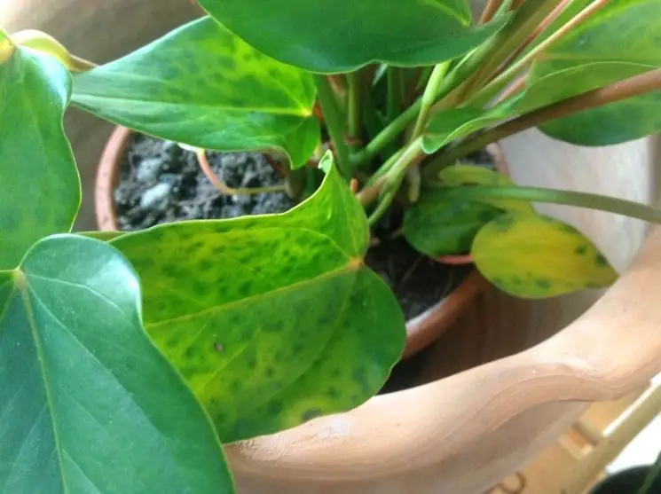 Una cosa que debes saber antes de comprar un Anthurium es que, contrariamente a la opinión popular, es una planta que no es precisamente fácil de cultivar. Puede suceder que después de un tiempo el Anthurium desarrolle hojas amarillas, que comprometen la belleza de la planta, y son un claro signo de su mala salud. Las causas que llevan al Anthurium a desarrollar hojas amarillaspueden ser muchos, pero todos son ambientales. En primer lugar hay que tener en cuenta que el anturio es una planta de origen tropical, por lo que necesita un riego constante. Por tanto, una primera razón del amarillamiento de las hojas de Anthurium podría ser la sequedad y aridez del sustrato, consecuencia de la escasez de riego. Incluso la iluminación deficiente del ambiente o por el contrario la exposición directa al sol pueden causar hojas amarillas en el Anthurium.