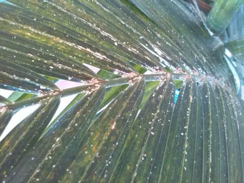 - Una de ellas es que las hojas de la palmera se cubrirán de una sustancia pegajosa. Esta sustancia pegajosa puede llegar a ser tan abundante que goteará de las hojas de la palmera sobre el suelo. Esta sustancia pegajosa será difícil de quitar y volverá si usted la quita.