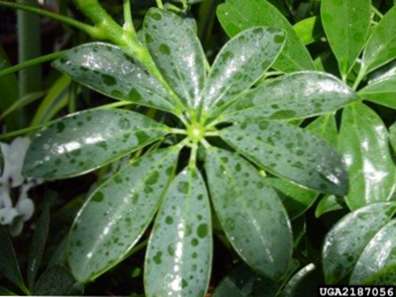 Cualquier Schefflera con sustancia pegajosa en las hojas puede ser tratada inicialmente llevándola al exterior y chorreando las hojas con agua. Los áfidos enjuagan las hojas y este tratamiento suele funcionar bien si se hace un seguimiento a la primera señal de las plagas.