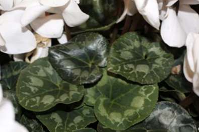 La mancha de la hoja causa manchas redondas que pueden ser amarillas, grises o marrones. Si se mira de cerca, se verán puntos negros dentro de las manchas. Aísle la planta para evitar que la enfermedad se propague. Trate de evitar que el agua caiga sobre las hojas o la corona cuando riegue la planta. Si no puede regar el ciclamen desde arriba sin mojar las hojas o la corona, riegue desde abajo.