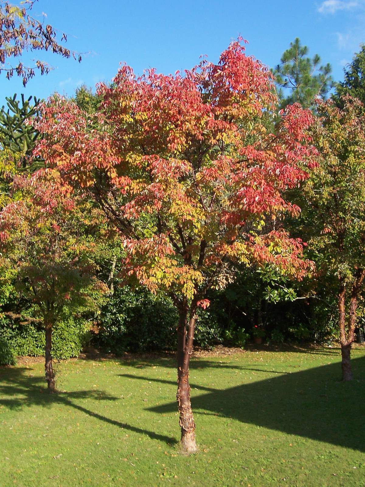 Malus tschonoskiiUn árbol estrechamente cónico con flores blancas, de color rosa en el capullo, fruta de color amarillo verdoso teñida de rojo y naranja, rojo y púrpura en el otoño. 8x4m (26½x13½ft)