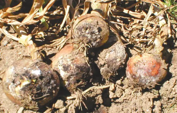 En las cebollas, chalotas y ajo, el principal problema es el bulbo, que también empieza a pudrirse. El crecimiento de hongos blancos y esponjosos aparece alrededor de la base del bulbo y más tarde éste se cubre de pequeñas estructuras de hongos redondos y negros.