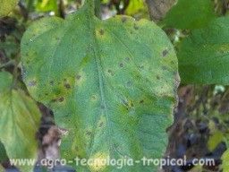se convierten en vidriados en el centro y se agrietan. Esto produce agujeros de disparo a medida que la enfermedad progresa. Las lesiones crecen hasta 1/8 (.31cm.) de diámetro. Las hojas afectadas mueren y se caen. Los tallos también desarrollan manchas, principalmente tallos jóvenes y peciolos. Las hojas caídas consistentemente pueden llevar a la insolación de la fruta, lo que puede hacer que el tomate sea desagradable al paladar.